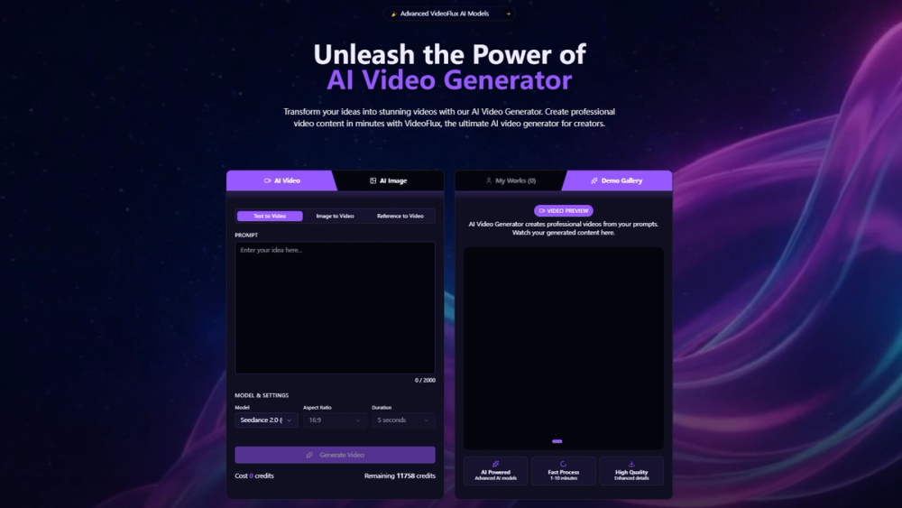 VideoFlux is an AI-powered video generation tool that converts text prompts and images into professional-quality videos. It supports text-to-video, image-to-video, and image-to-image creation, allowing users to produce marketing videos, social content, ads, and creative visuals quickly. The platform offers flexible input options, style customization, fast generation, and an easy workflow for creating and managing projects. VideoFlux is designed for creators, marketers, and businesses looking for a faster and more cost-effective way to produce video content.